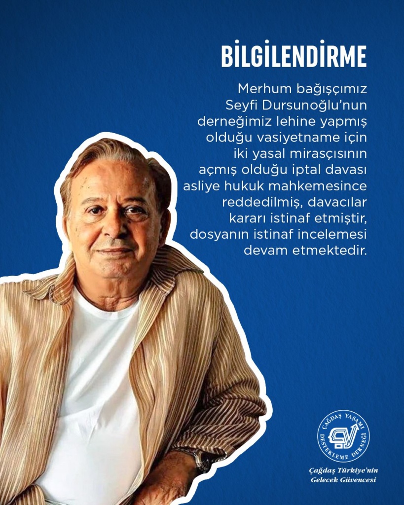 Merhum bağışçımız Seyfi Dursunoğlu’nun derneğimiz lehine yapmış olduğu vasiyetname için iki yasal mirasçısının açmış olduğu iptal davası asliye hukuk mahkemesince reddedilmiş, davacılar kararı istinaf etmiştir, dosyanın istinaf incelemesi devam etmektedir.