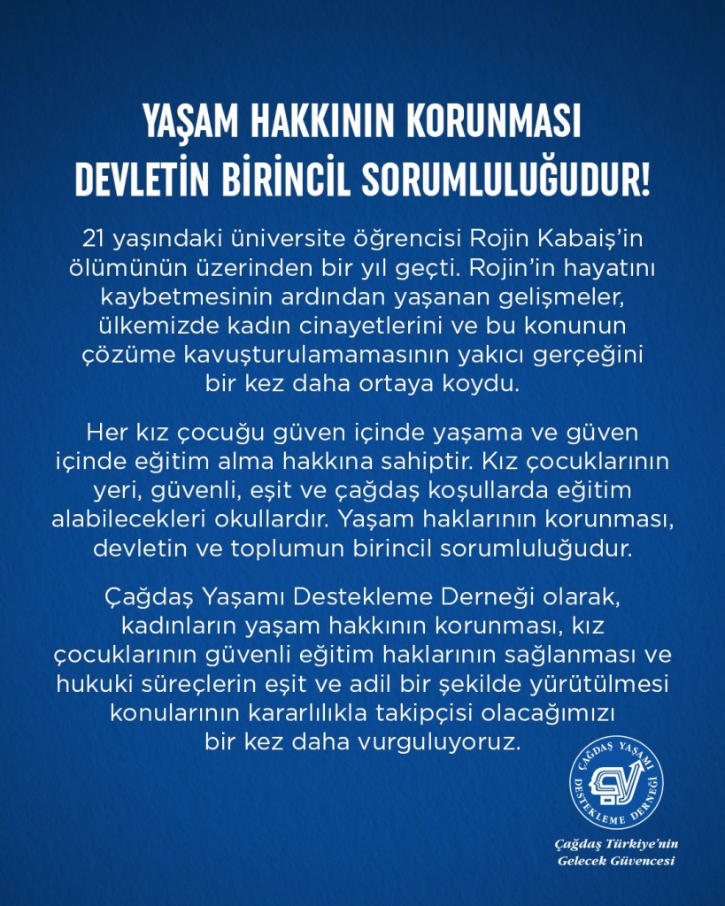 Çağdaş Yaşamı Destekleme Derneği olarak, kadınların yaşam hakkının korunması, kız çocuklarının güvenli eğitim haklarının sağlanması ve hukuki süreçlerin eşit ve adil bir şekilde yürütülmesi konularının kararlılıkla takipçisi olacağımızı bir kez daha vurguluyoruz.